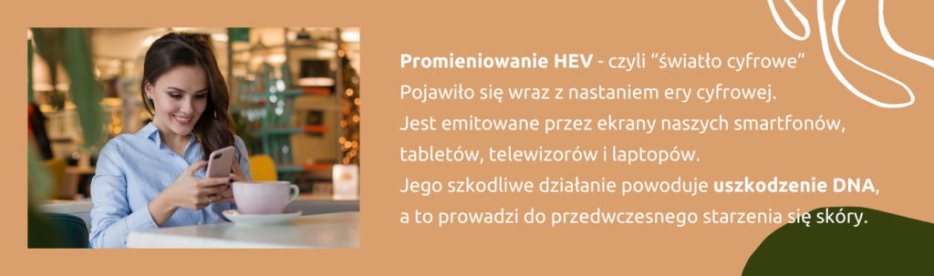 Badania dowodzą, że może mieć jeszcze bardziej szkodliwe działanie niż UV. Teraz gdy czytasz ten tekst na smartfonie to niebieskie światło wnika głęboko w Twoją skórę, aktywując wolne rodniki, które skutecznie uszkadzają włókna kolagenowe i elastynowe. HEV dodatkowo uszkadza DNA skóry oraz niszczy lipidy (czyli komórki tłuszczowe). Co to oznacza? – im więcej czasu spędzasz nad monitorem (np. w pracy) lub przy telefonie możesz mieć większe predyspozycje do powstawania zmarszczek i przesuszania się skóry. Może również potęgować stany zapalne przy trądziku.